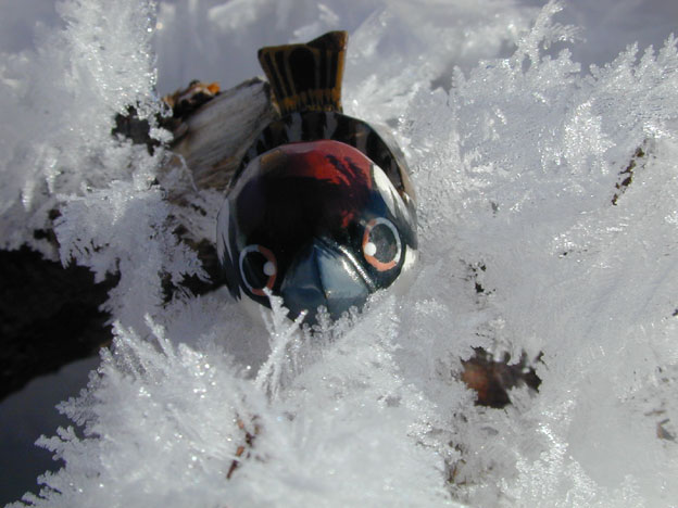 春になって、いろいろな花が咲き始めたら、一緒に撮ろうと、セキレイの大きさを三種類作りました。これは一番小さいものです。昨年はスズメばかり出しゃばっていましたが、ちいさな物が他に無かったからです。これはネクタイピンとしてアクセサリーにしてもいいと思います。ラブバードはアクセサリーでした。 |